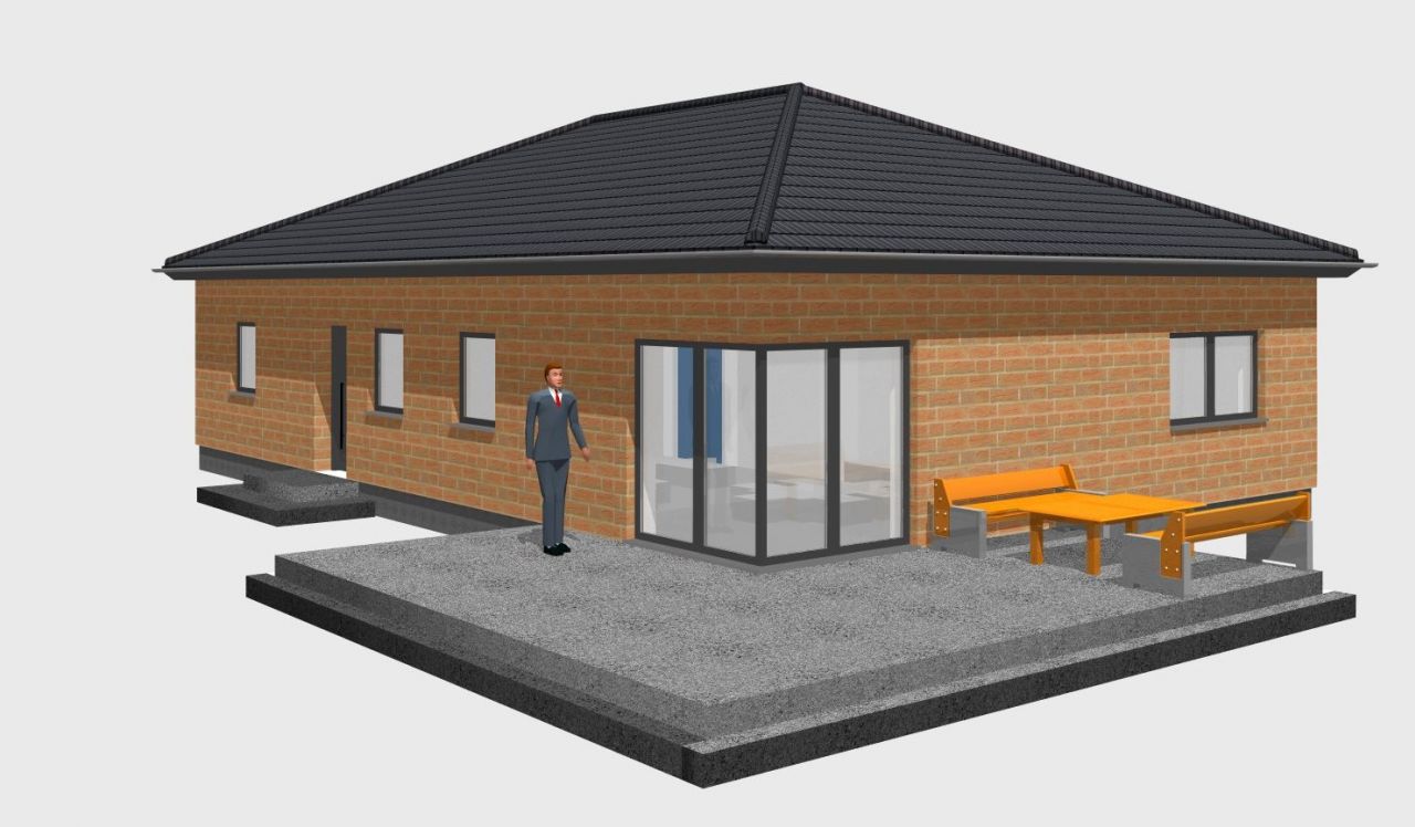 Walmdach Bungalow mit 107qm Wonhfläche und 4 Zimmern. Dieses Bungalow hat einen offenen Wohn- und Essbereich mit offener Küche.
