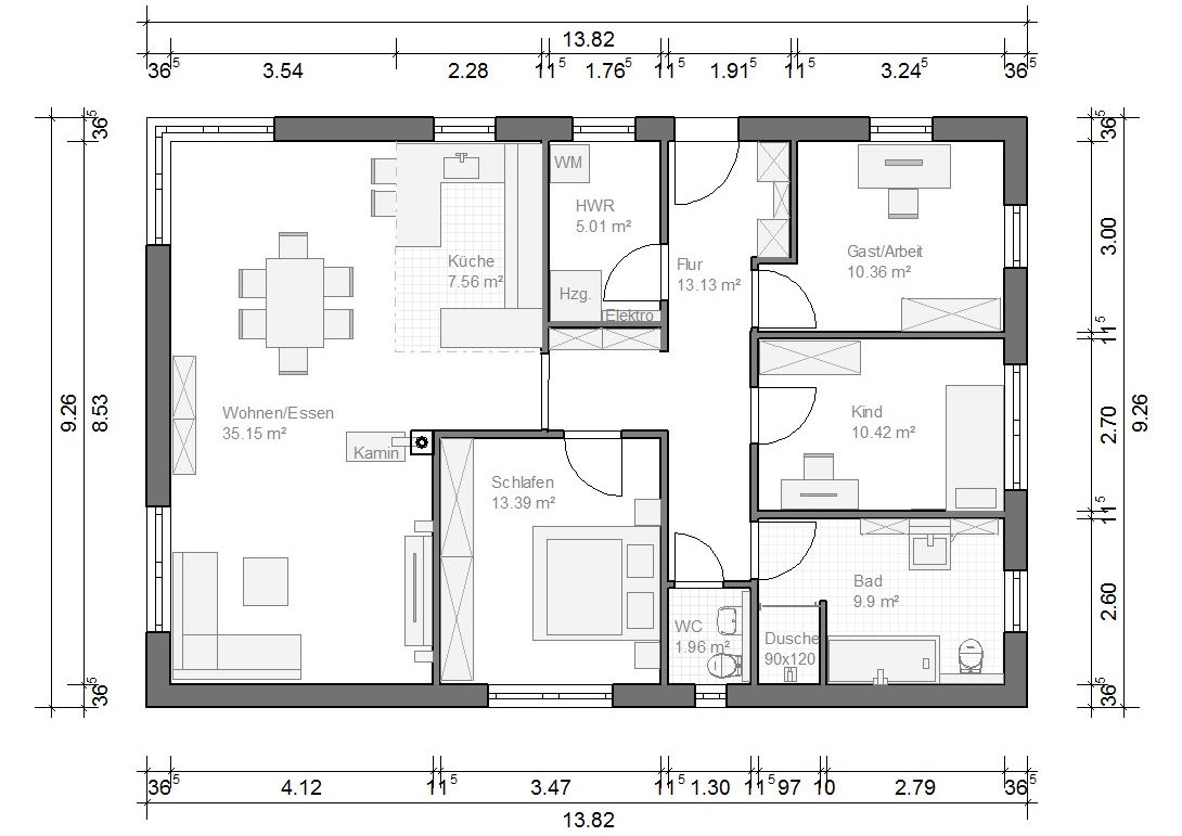 - Wandaufbau: Ökologische und diffusionsoffene Außenwand mit Naturbaustoffen oder als Massivhaus in Poroton-Ziegelbauweise