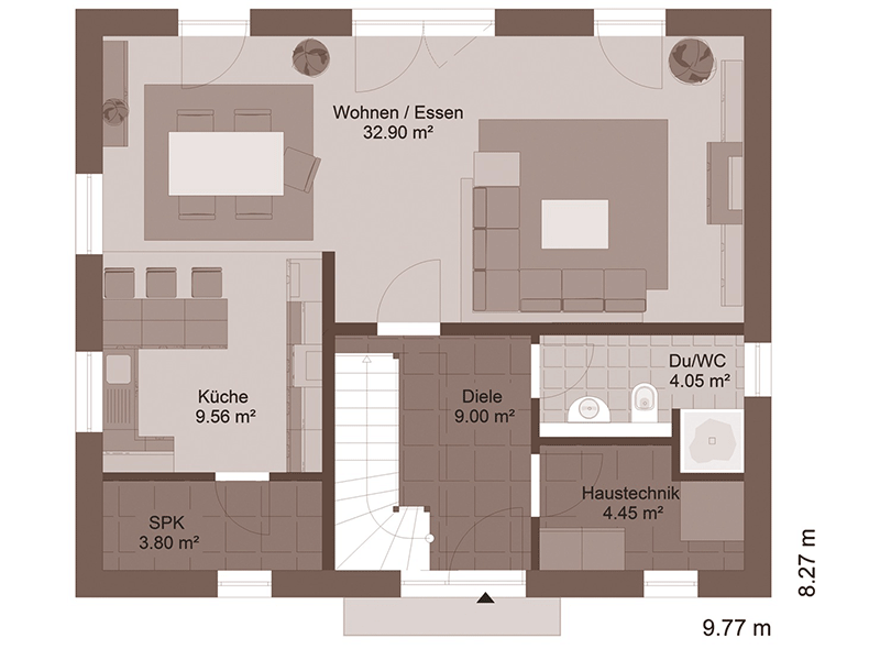 Das Livingstar 5 ist ein klassisches Einfamilienhaus mit Krüppelwalmdach und offenem Wohn- und Essbereich.